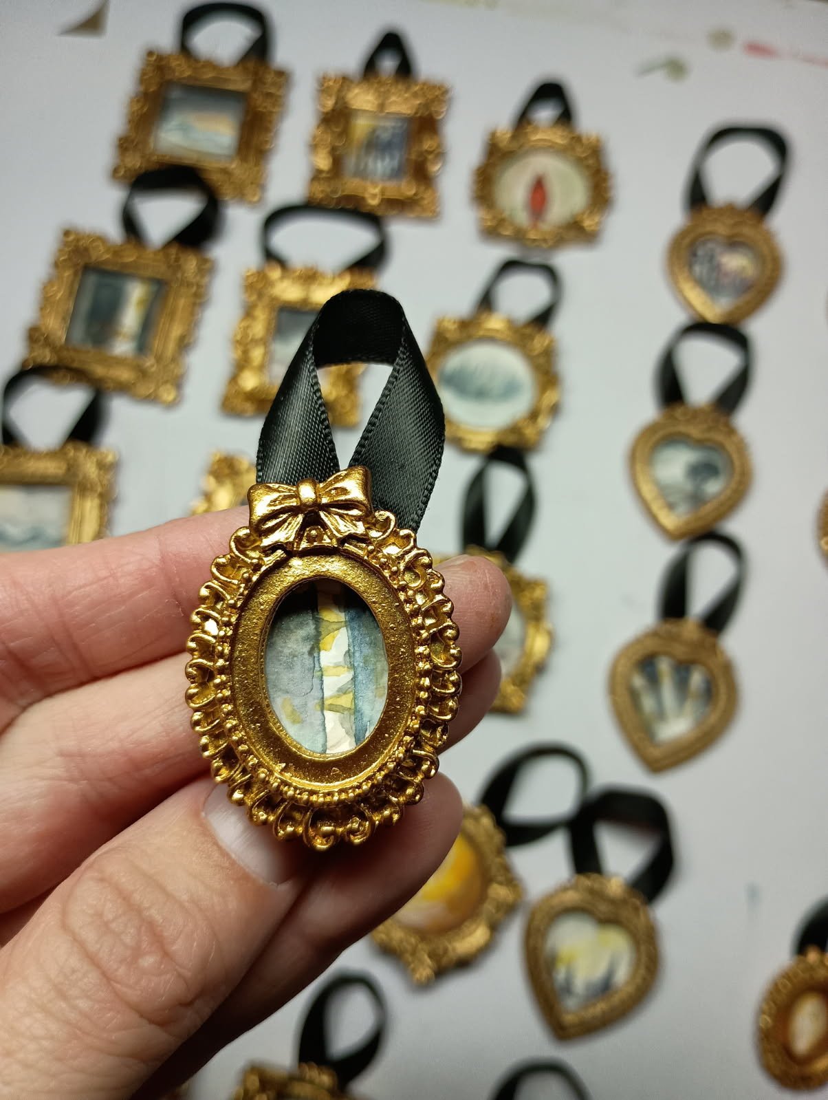 Micro Original Painting: Rustic Birch Tree Art Magnet & Ornament - Vintage Gold Frame