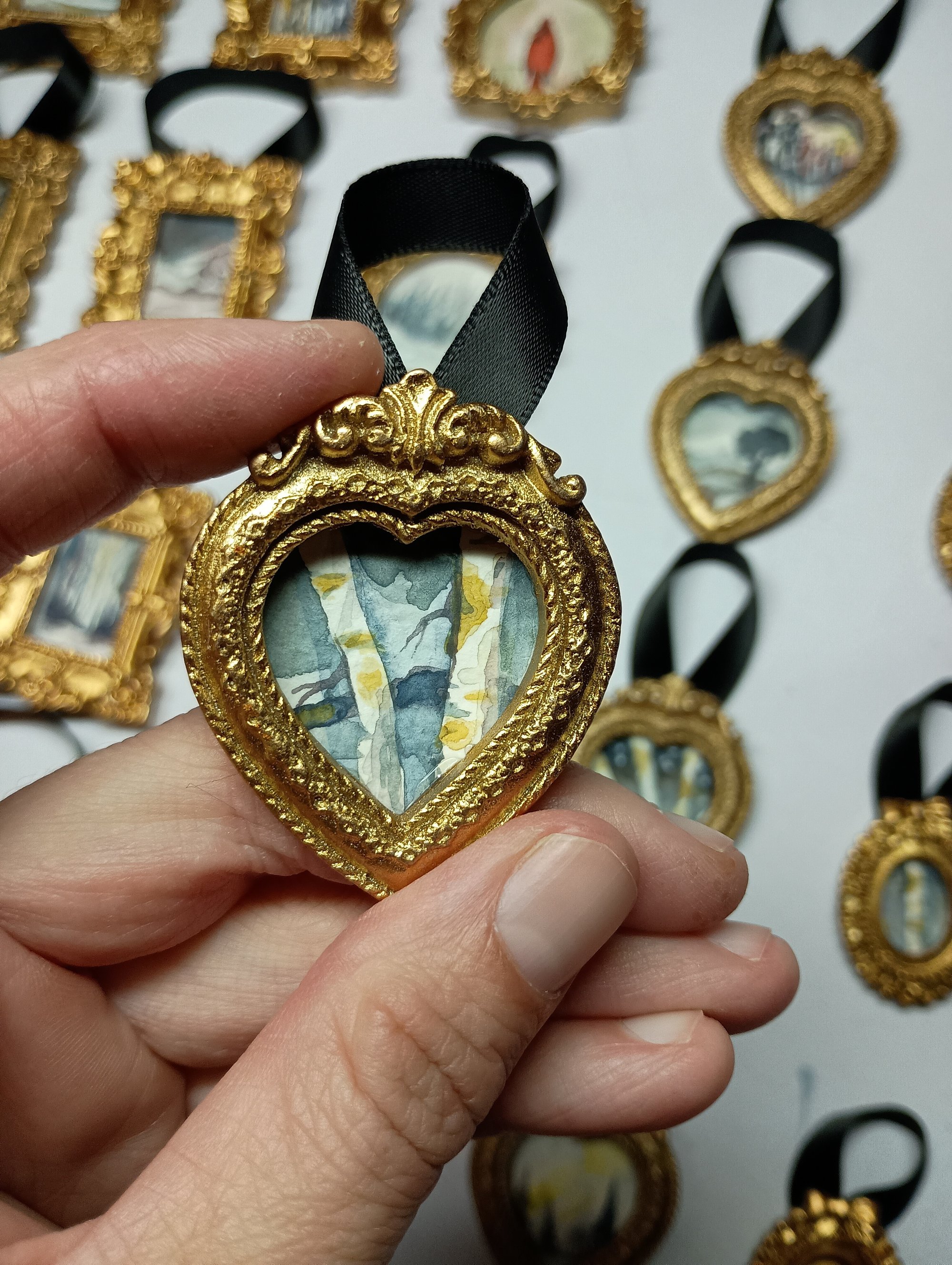 This original, hand-painted miniature watercolor captures a tranquil view of birch tree trunks, utilizing cool grays, blues, and bright yellow accents. This unique piece is collectible and beautifully framed, in a heart-shaped vintage gold frame. Adding a romantic or sentimental touch to the natural subject matter.