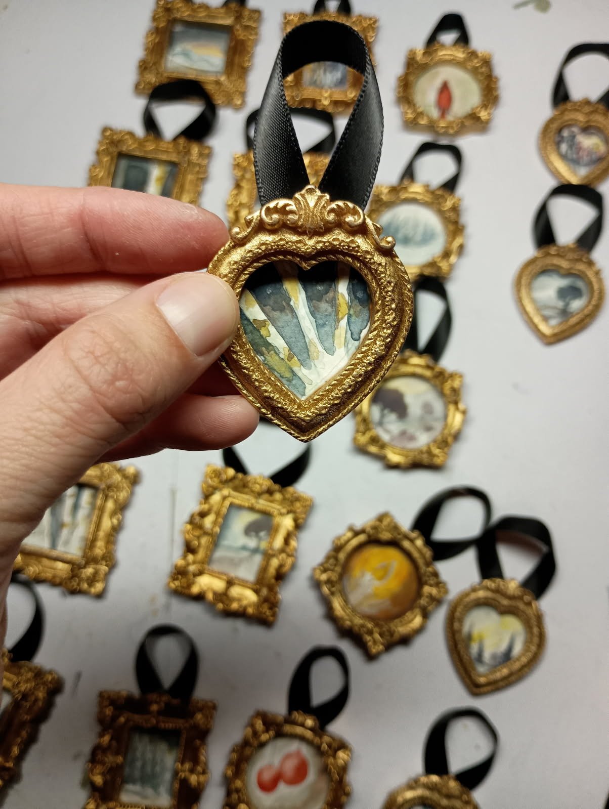 This original, hand-painted miniature watercolor offers a rustic and distinctive take on birch tree trunks, featuring bold vertical strokes in white, gray, cool blues, and warm yellows. This highly artistic piece is perfect for those who appreciate natural and cozy decor. The artwork is beautifully framed in a heart-shaped vintage gold frame, adding a sentimental touch and making this collectible miniature a unique and elegant piece.
