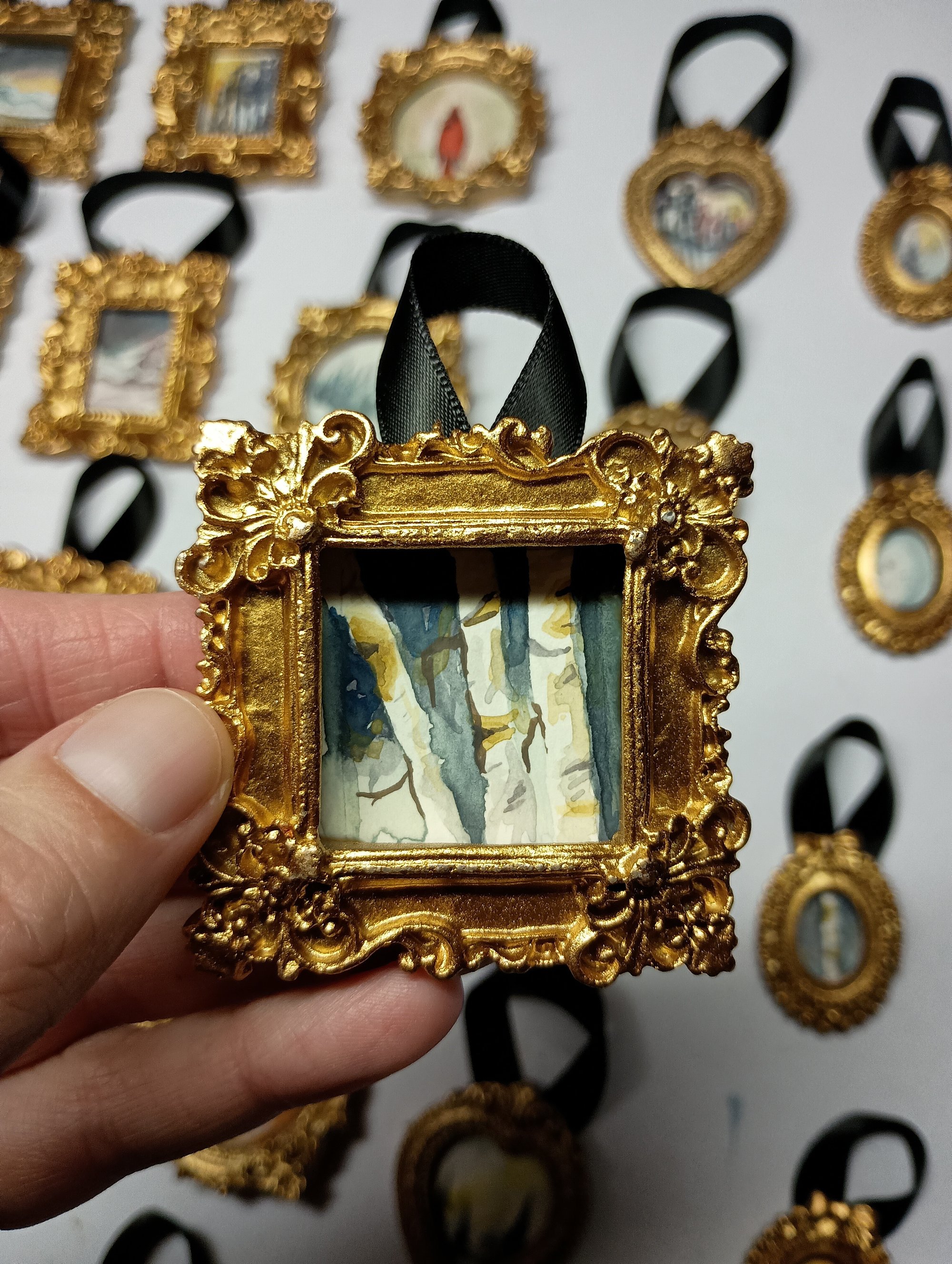 Miniature Original Painting: Rustic Birch Trunks Art Ornament - Vintage Gold Frame