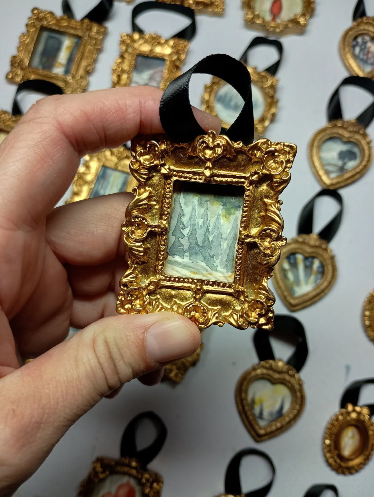 Miniature Original Painting: Snowy Winter Forest Art Magnet & Ornament - Vintage Gold Frame
